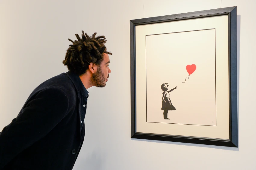 Одна из самых известных работ Бэнкси "Девушка с воздушным шариком"Бэнкси — один из самых загадочных и востребованных художников современности. По результатам опроса, проведённого в Великобритании, его работа "Девушка с воздушным шариком" была признана самым любимым произведением в стране. Помимо этого, на родине его вклад в искусство оценивают выше, чем у таких художников, как Рембрандт и Клод Моне. В своих работах Бэнкси часто высмеивает социальные и политические аспекты современного общества, критикует государственных лидеров и указывает на человеческие пороки, а его инсталляции, продающиеся на аукционах за миллионы долларов, привлекают внимание как коллекционеров, так и воров и вандалов.