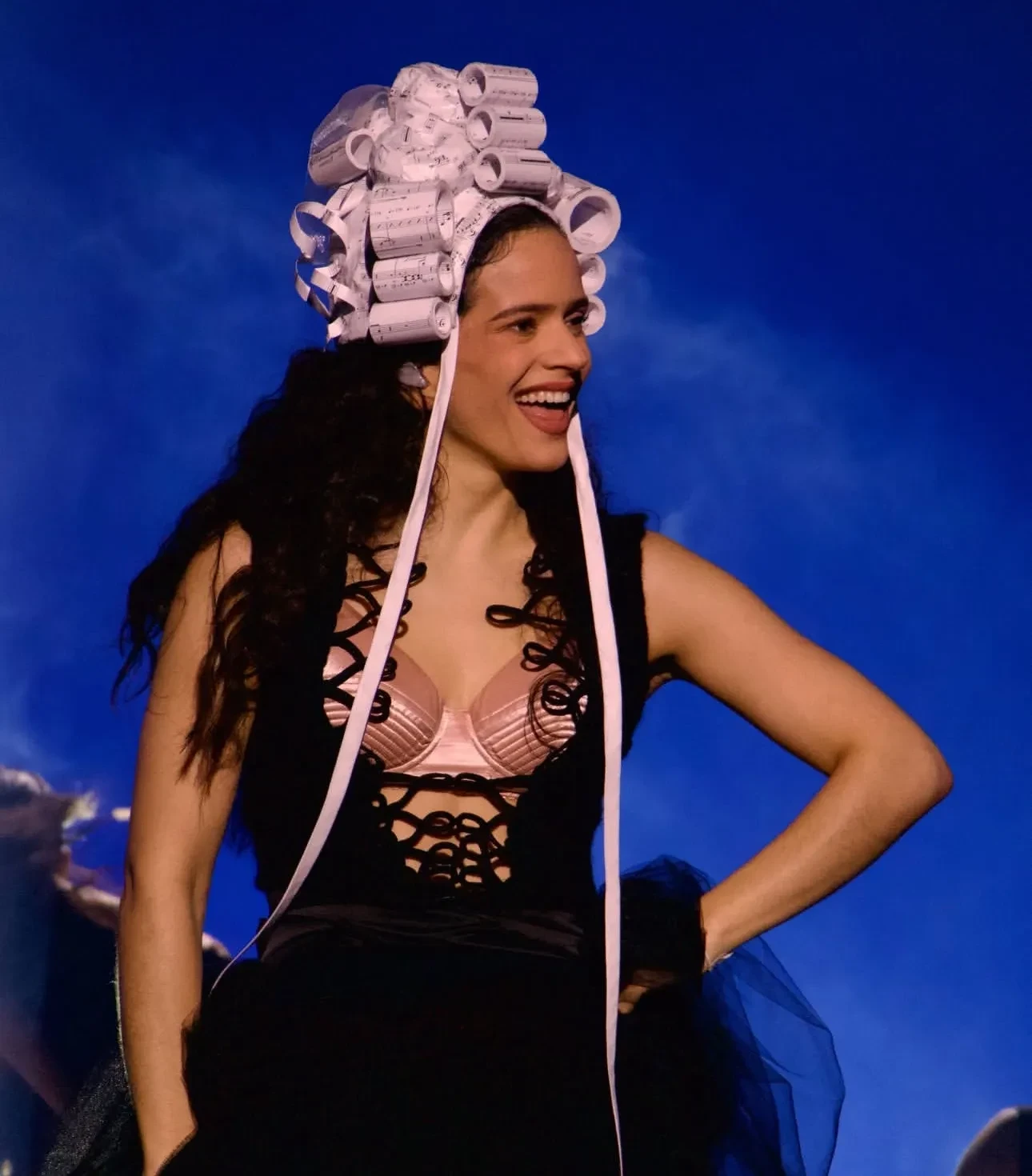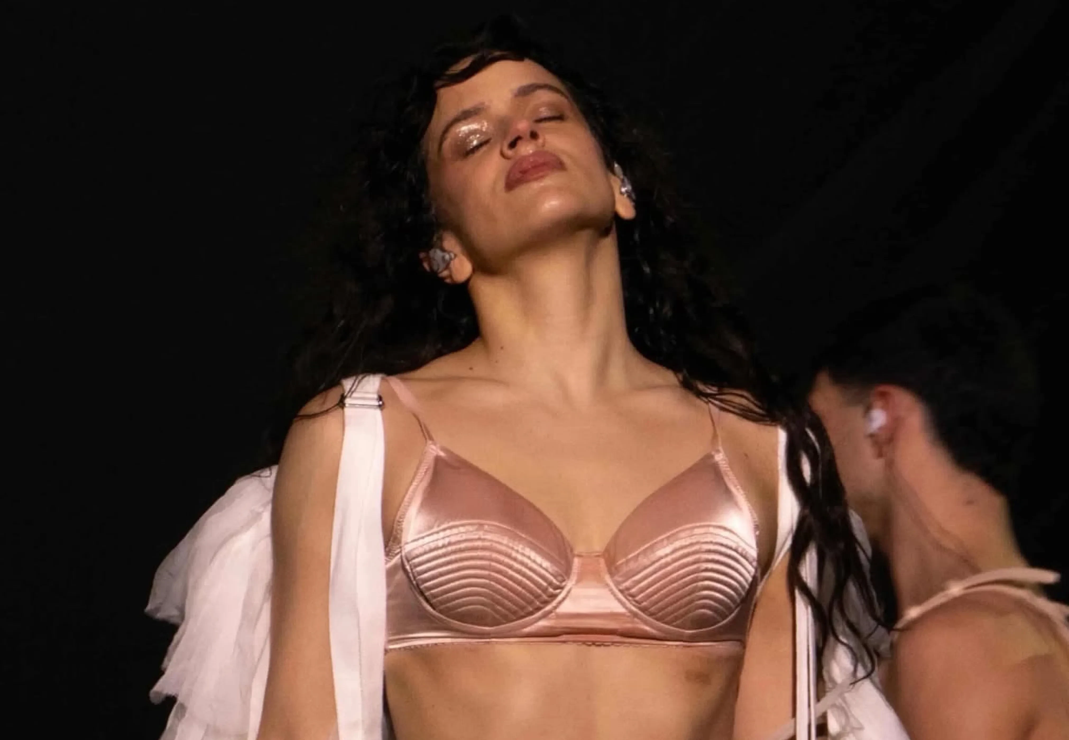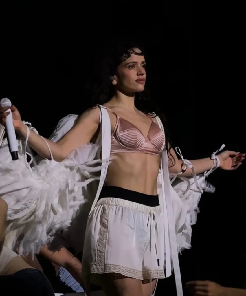 РозалияРозалия исполнила несколько песен в розовом атласном бра. Известно, что тур певицы продлится до сентября и завершится в Пуэрто-Рико, поэтому есть вероятность, что данный наряд мы увидим ещё не раз на певице.