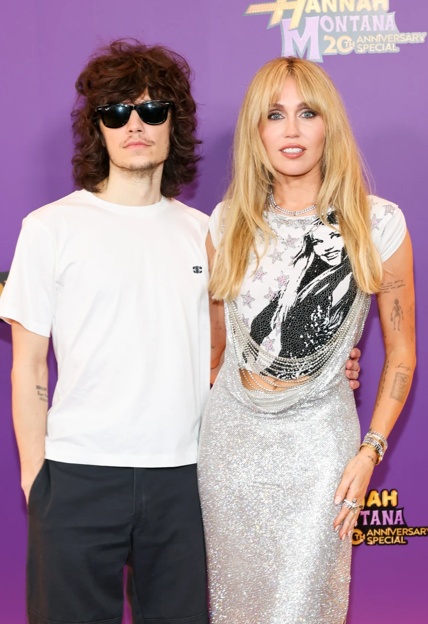 Майли Сайрус с сестрой Брэнди и матерью ТишДля выхода на ковровую дорожку Майли Сайрус выбрала сверкающее платье в пол Rabanne, а её жених появился в простом классическом образе: белой рубашке, чёрных брюках и чёрно-белых кроссовках.