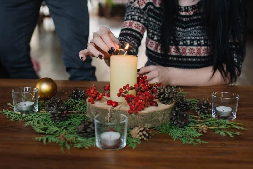 Первое, что видят гости — это вход. Повесь рождественский венок с шишками и красными лентами, укрась зеркало снежинками или подсветкой из гирлянды.