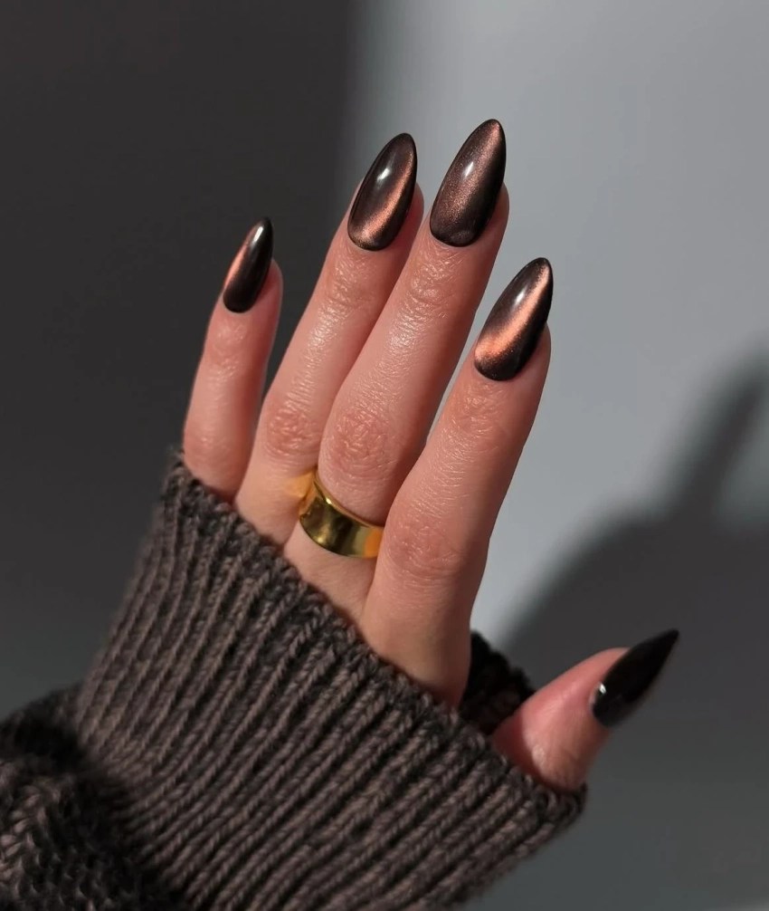 Хромированные покрытия будто созданы для декабрьских вечеров. Они отражают свет гирлянд, свечей, праздничных витрин и создают на ногтях эффект настоящей зимней магии.
