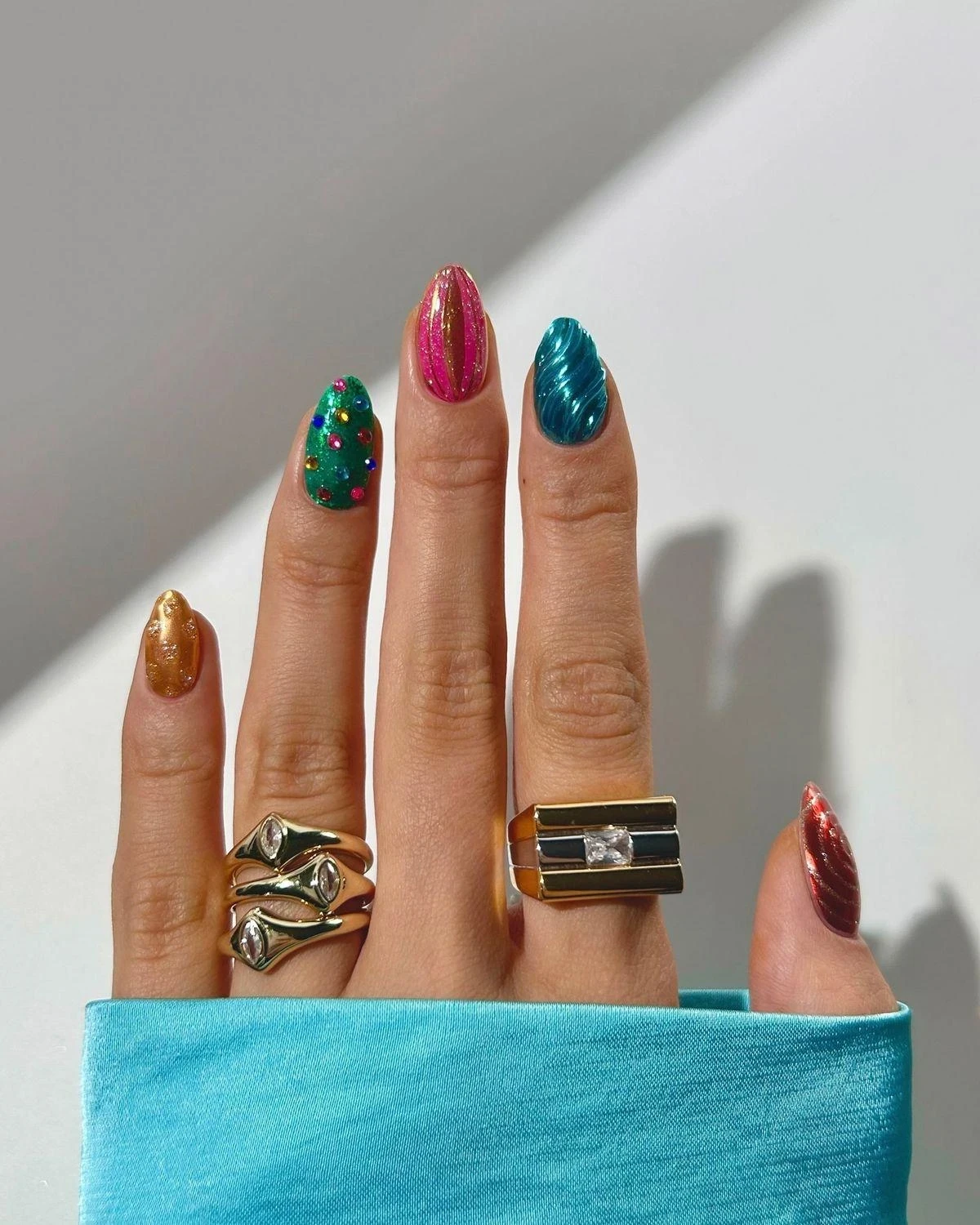 Перед праздниками фантазия может быть особенно смелой. Дофаминовый маникюр не обязательно должен быть сложным, но он всегда привлекает внимание. Среди популярных идей:
