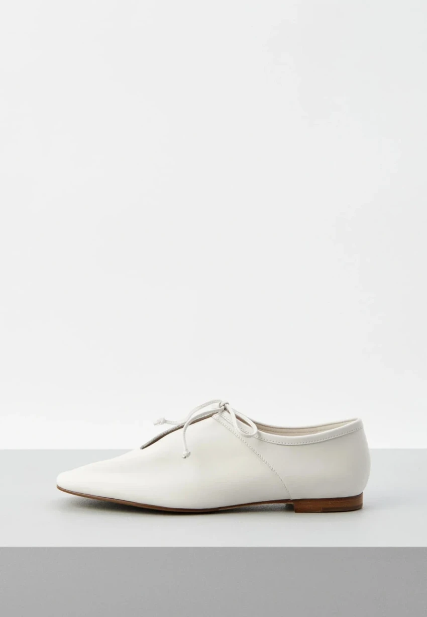 Джазовые туфли — один из самых «тихих», но перспективных трендов сезона. Это нечто среднее между дерби и балетками: мягкая кожа, тонкая подошва, простая шнуровка и очень чистый дизайн.