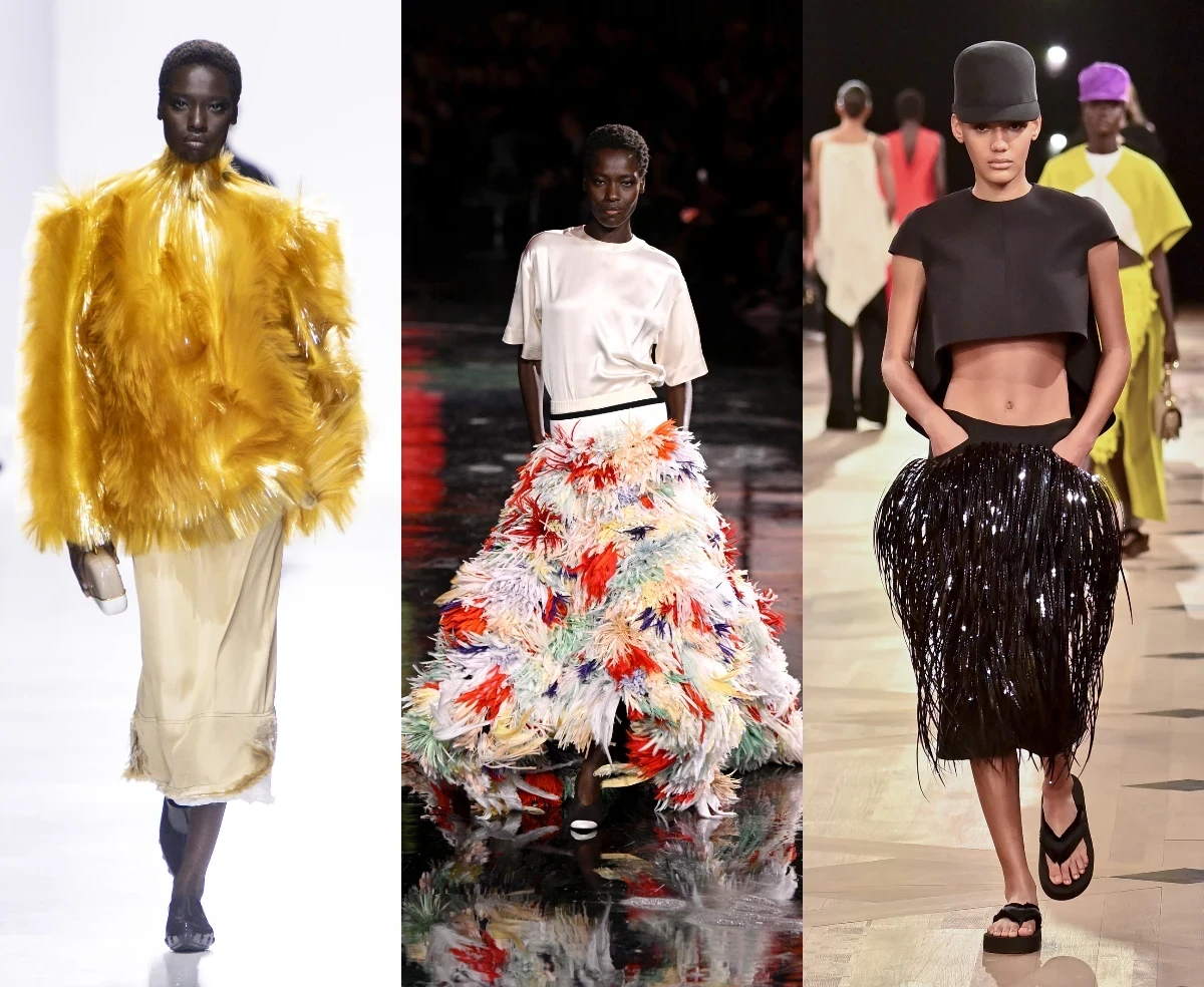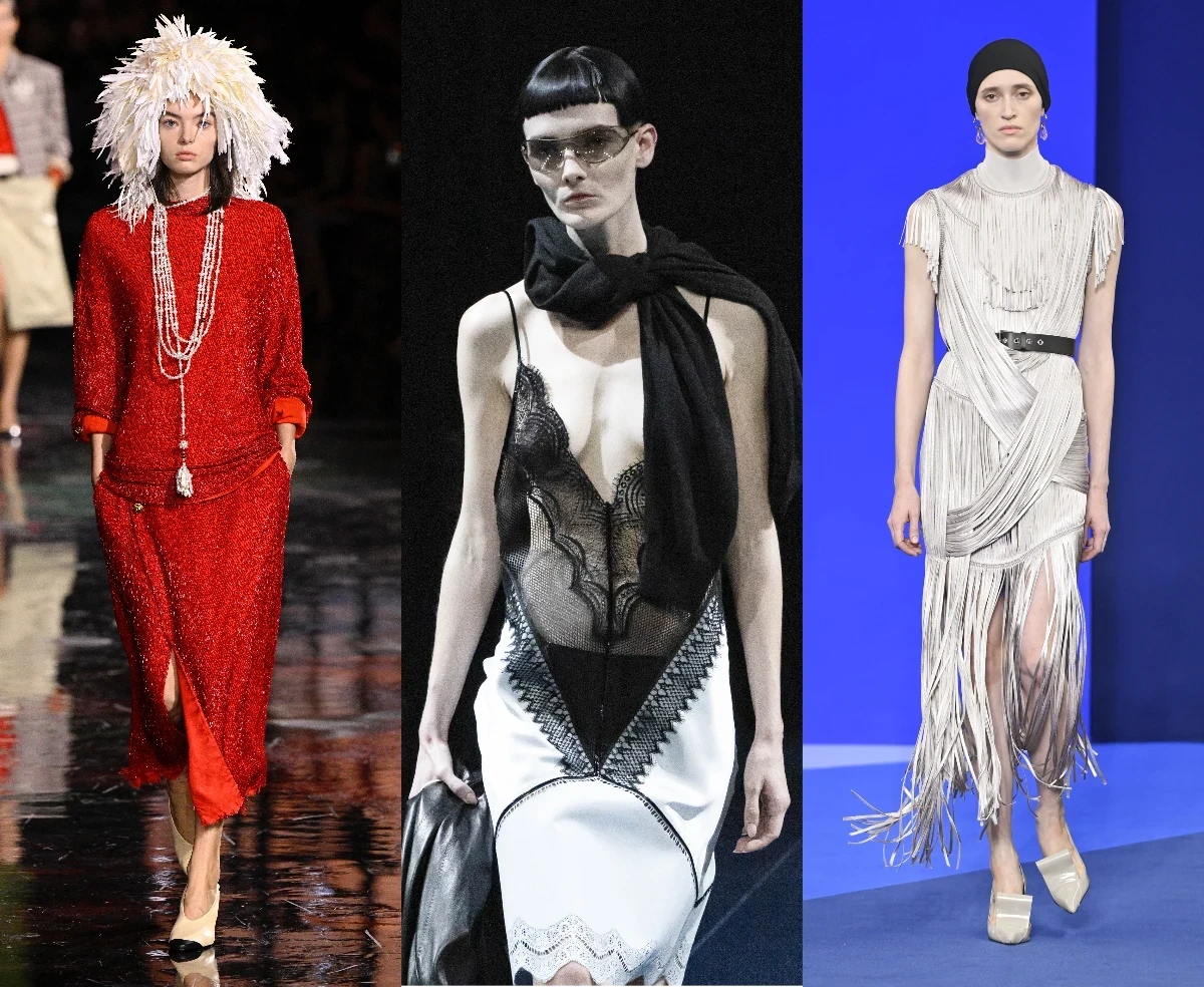 Бахрома стала не украшением, а движением. Стекловолоконные нити Bottega Veneta, перьевое платье Chanel — яркие примеры. Даже в повседневности бахрома работает, если уравновесить ее базой.
