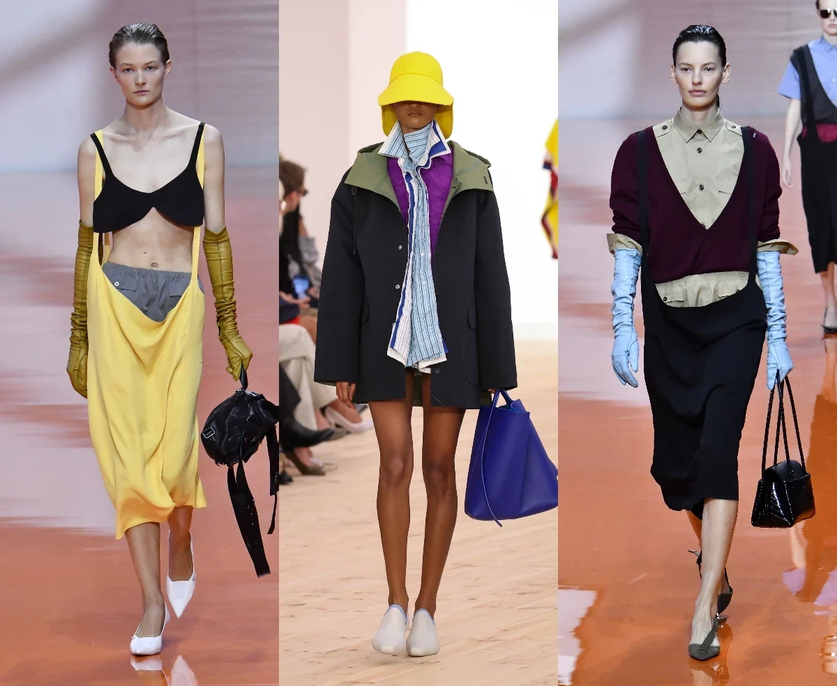 Базовые вещи получают вторую жизнь. Loewe наслаивают десятки рубашек, Prada объединяет прозрачные юбки, белье и аксессуары в многогранные ансамбли. Главная идея — использовать то, что уже есть в гардеробе.