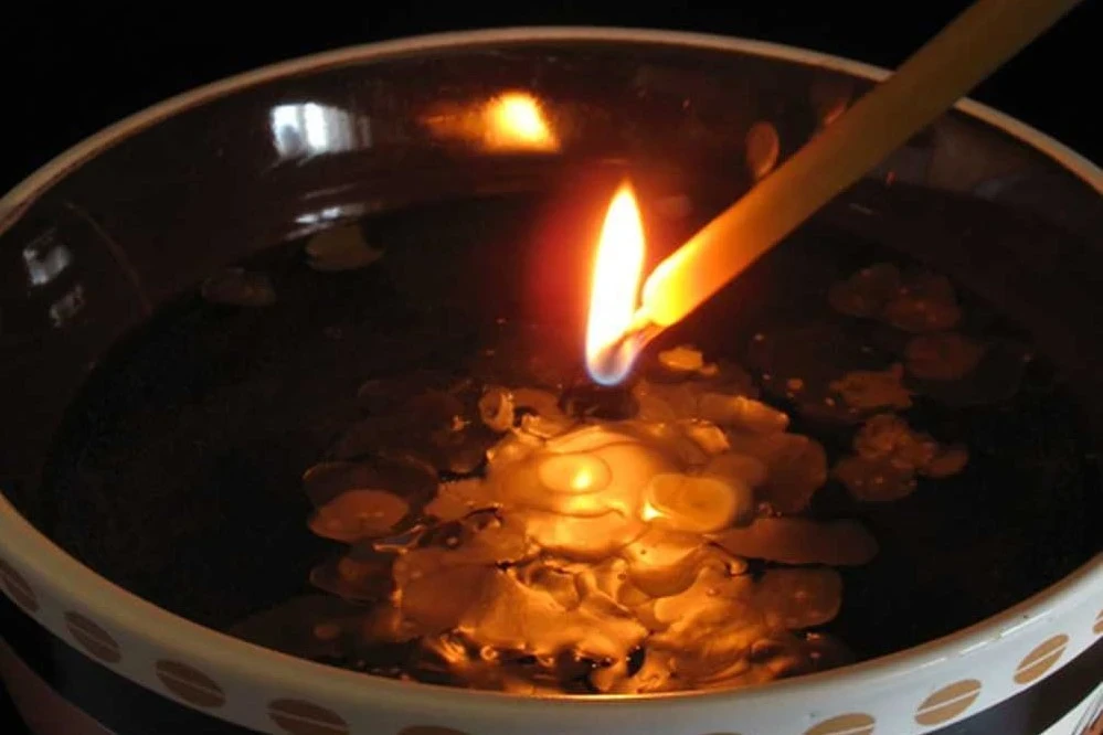Понадобятся свеча, спички и миска с холодной водой.