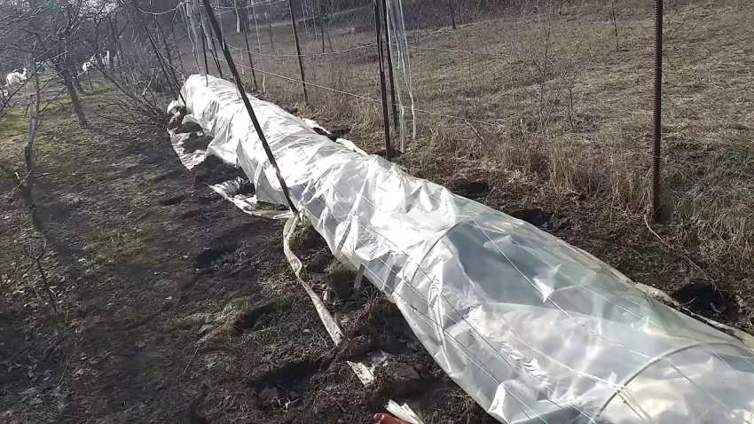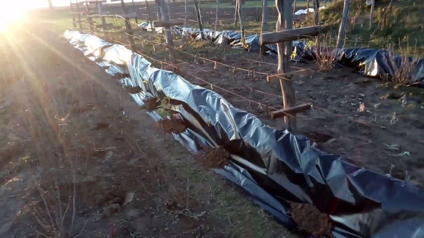 Сразу после обрезки лозы снимают со шпалеры, объединяют в пучки и пригибают к земле до морозов, пока они гибкие.